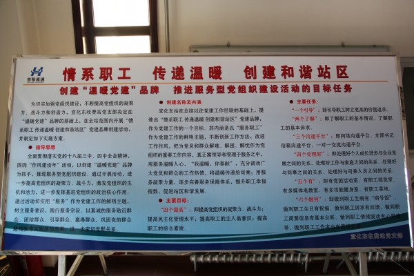 展板涵蓋了創(chuàng)建活動的指導思想、創(chuàng)建名稱及內(nèi)涵、主要目標任務等方面的內(nèi)容。提出了“情系職工 傳遞溫暖 創(chuàng)建和諧站區(qū)”的創(chuàng)建口號并對其內(nèi)涵進行解釋說明。制定了“四個提高”的目標,即提高黨組織的凝聚力、戰(zhàn)斗力;提高民主化管理水平;提高職工的主人翁意識;提高職工的綜合素質(zhì)。確立了創(chuàng)建活動的六個主要任務,分別為“一個引導”:即引導職工樹立更高的價值追求;“兩個了解”:即了解職工的基本情況、了解職工的基本訴求;建立“三個溝通平臺”:即網(wǎng)絡溝通平臺、支部書記信箱溝通平臺、一對一交流溝通平臺;“四個處理好”:即處理好個人成長進步與企業(yè)發(fā)展之間的關系、處理好工作與家庭之間的關系、處理好與同事之間的關系、處理好與司乘人員之間的關系;“五個有”:即有黨團活動室、有職工閱覽室、有多媒體電教室、有多功能健身室、有職工菜地;“六個做到”:即做到職工生病有“病號飯”、做到職工生日有祝福、做到職工訴求有回饋、做到職工簡要信息有基本臺賬、做到職工情緒波動有心里疏導、做到職工工作突出有表揚獎勵。