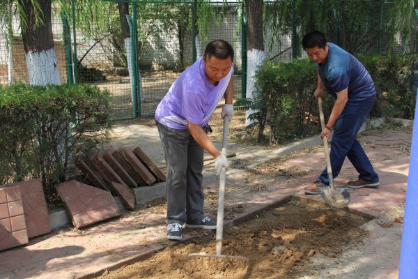 6月15日,郭強、段建平等幾名老同志主動到職工菜地勞動,為菜地除草、澆水。當(dāng)發(fā)現(xiàn)菜地一角堆積了一些廢舊磚塊時,幾名老大哥一商量,干脆廢物利用,用這些磚塊為職工鋪一條采摘小路,大家紛紛表示贊同并積極加入勞動隊伍。小路修好后,干勁高漲的人們又一鼓作氣對“鼓包”的方磚路面進行了修整。